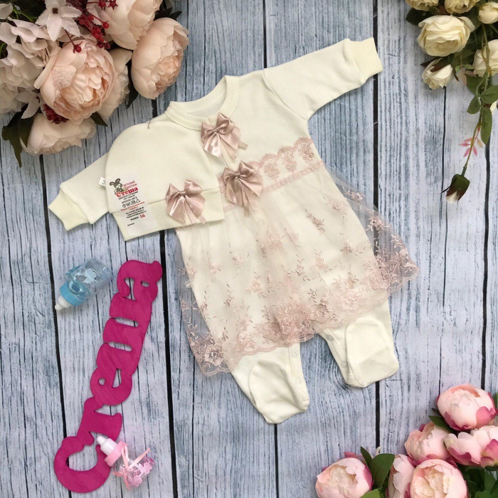 Комбинезон "Бабочка-пудра" + шапка из интерлока-пенье. Украшен кружевом