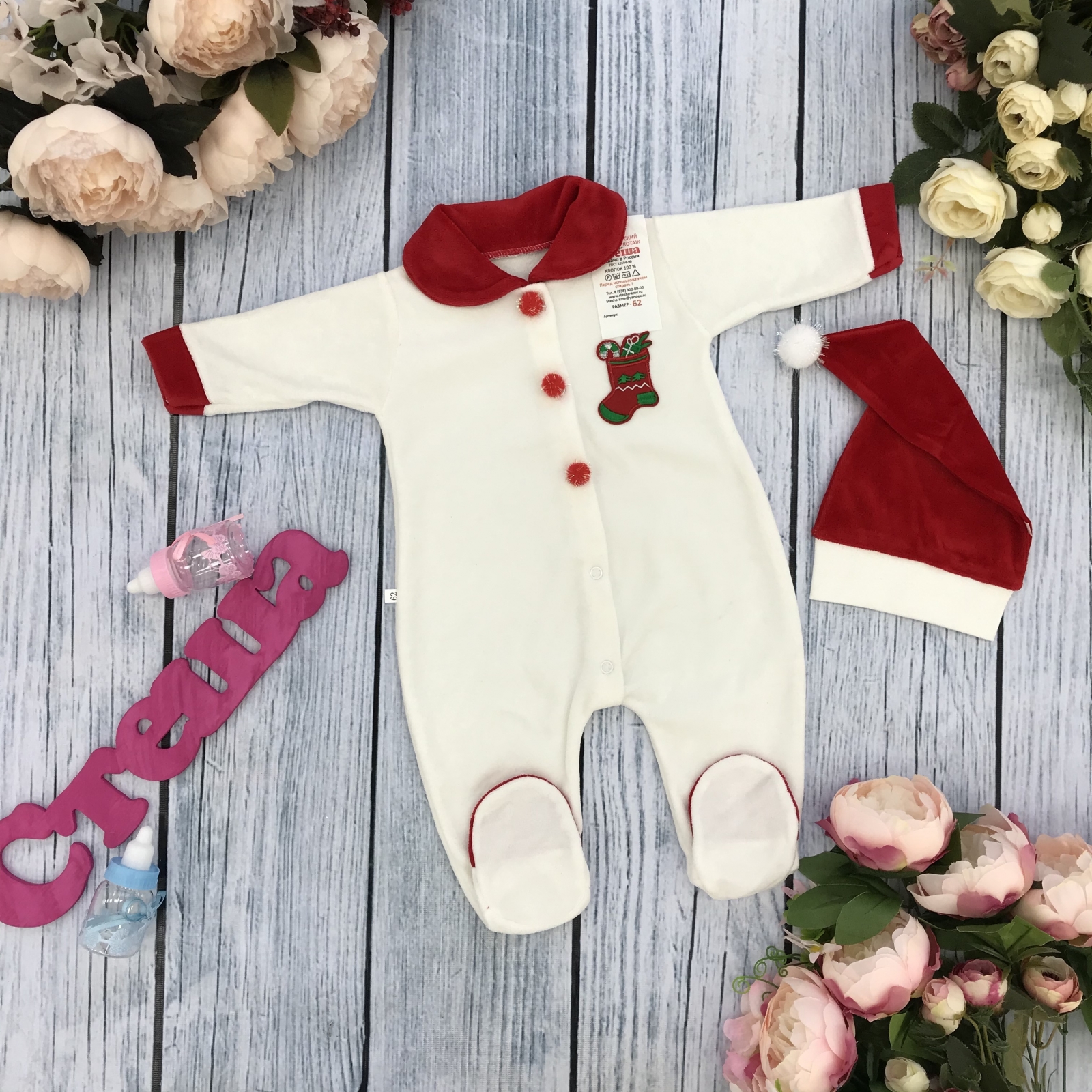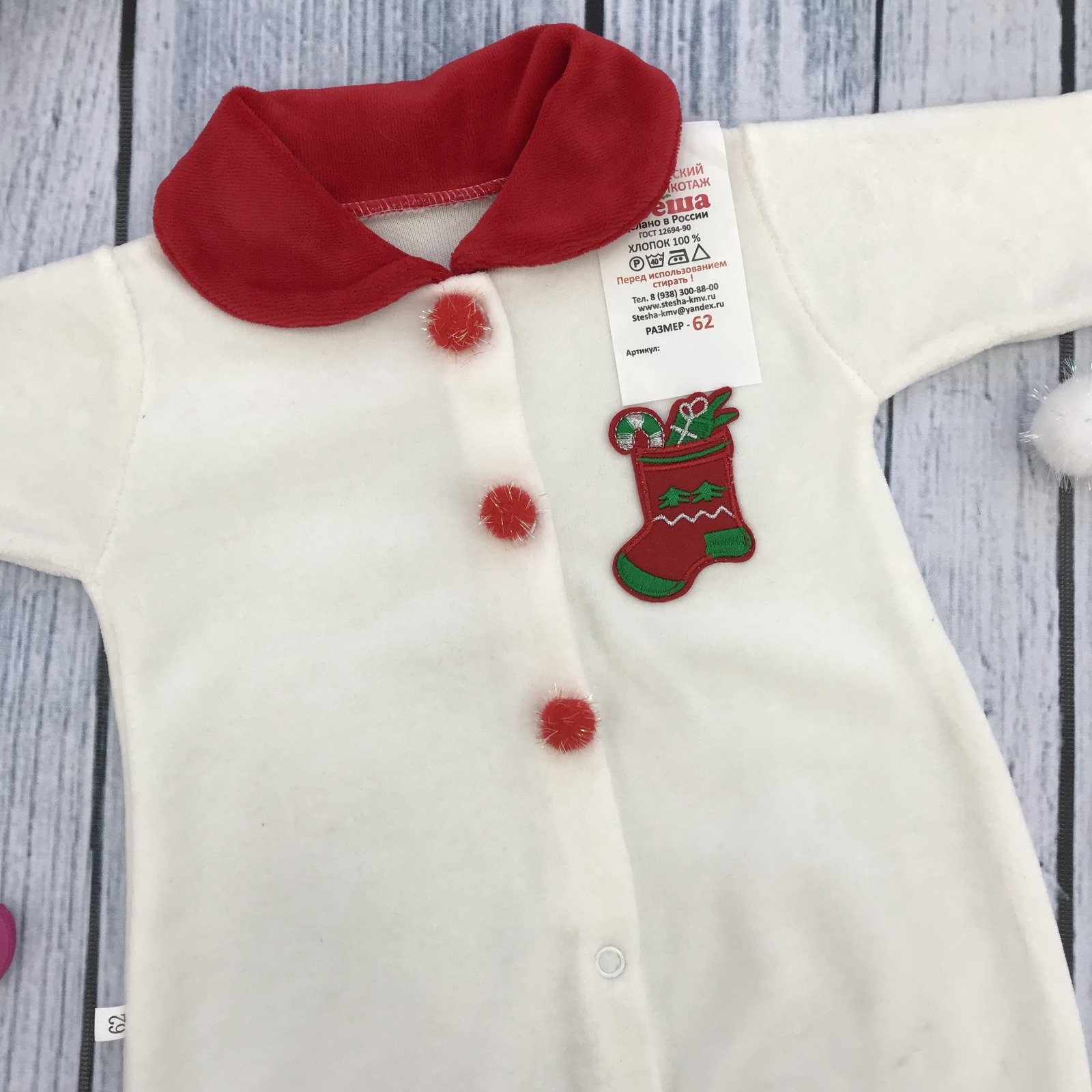 Теги: Купить оптом новогодний комбинезон от производителя. 244. Комбинезон Санта, хлопок 80% велюр 20% ПЭ, молочный 56,62,68 цена,отзывы официальный сайт "Стеша Нефтеюганск"
